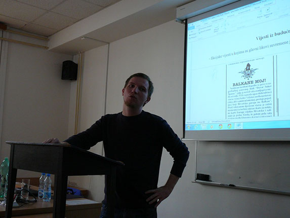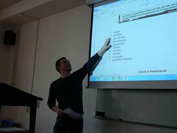 V rámci II. kroatistických setkání jsme v Brně přivítali čtyři hosty z Chorvatska, Bosny a Hercegoviny a Polska. Dr. Paulina PYCIA ze Slezské univerzity v Katovicích si připravila výukový blok věnovaný translatologickým tématům. Dr. Branislav OBLUČAR z Ústavu komparativní literatury FF v Záhřebu představil současnou chorvatskou poezii a jeho fakultní kolega z Ústavu kroatistiky dr. Nikola KOŠĆAK pojednal o rétorice odporu v chorvatské hudbě, tisku a současné próze. K jeho přednáškovému cyklu se též pojila projekce dokumentárního filmu o jugoslávském punku a nové vlně Šťastné dítě (2003, Igor Mirković). Součástí druhých setkání byl rovněž literární večer s básnířkou a blogerkou Asjou BAKIĆ. Domácí barvy tentokrát hájila Mgr. Mirna STEHLÍKOVÁ ĐURASEK, která se ve své přednášce zabývala frazeologickými potížemi, s nimiž se potýkají studenti chorvatského jazyka.